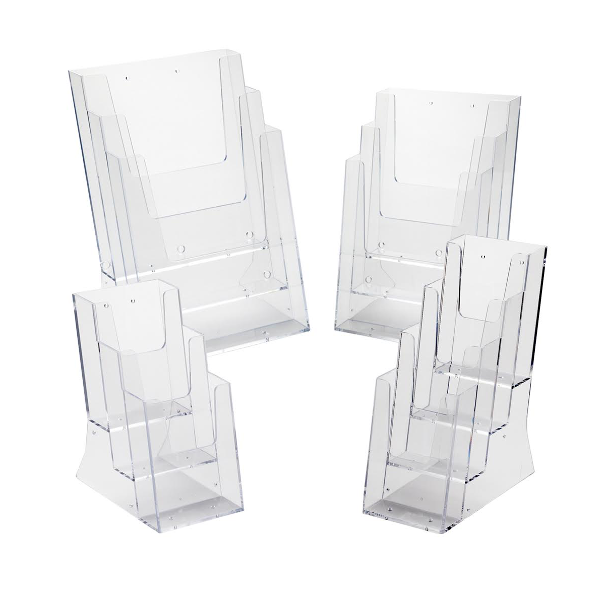 Our multi tiered leaflet holders provide an attractive display method for leaflets, brochures and magazines. We have 3 tier DL leaflet holders, 3 tier A4 leaflet holders, 3 tier A5 leaflet holders and we now also offer a 4 tier DL leaflet holder, all of our products are in stock ready for next day delivery.