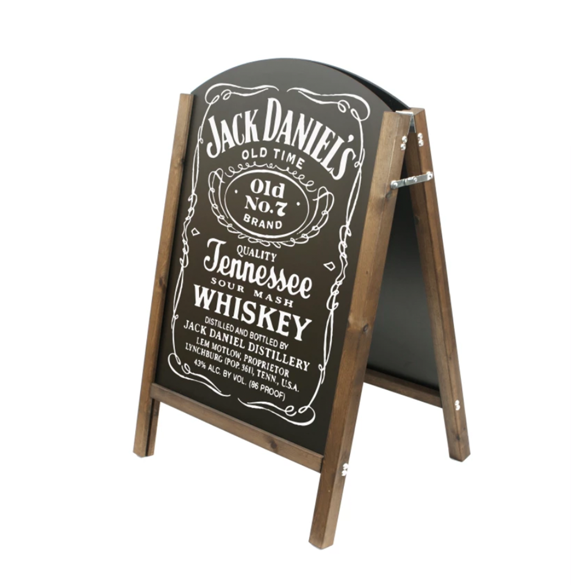 Our wooden curved top A-board is handmade in the UK, manufactured from solid American redwood. Each sign is manufactured with a reversible 6mm chalkboard panels which makes the perfect solution for interchanging your daytime and evening signage. These are suitable for interior and exterior usage and can withstand normal weather conditions. Finished with brass hinges and a metal locking latch to ensure the A-board stays in place. The A-boards are finished to a high standard and include rubber feet, you can write on the chalkboard panel with chalk & liquid chalk pens. The perfectly smooth finish makes a great surface for printing or vinyl lettering, which is great if you wish to include your companies very own logo or message.